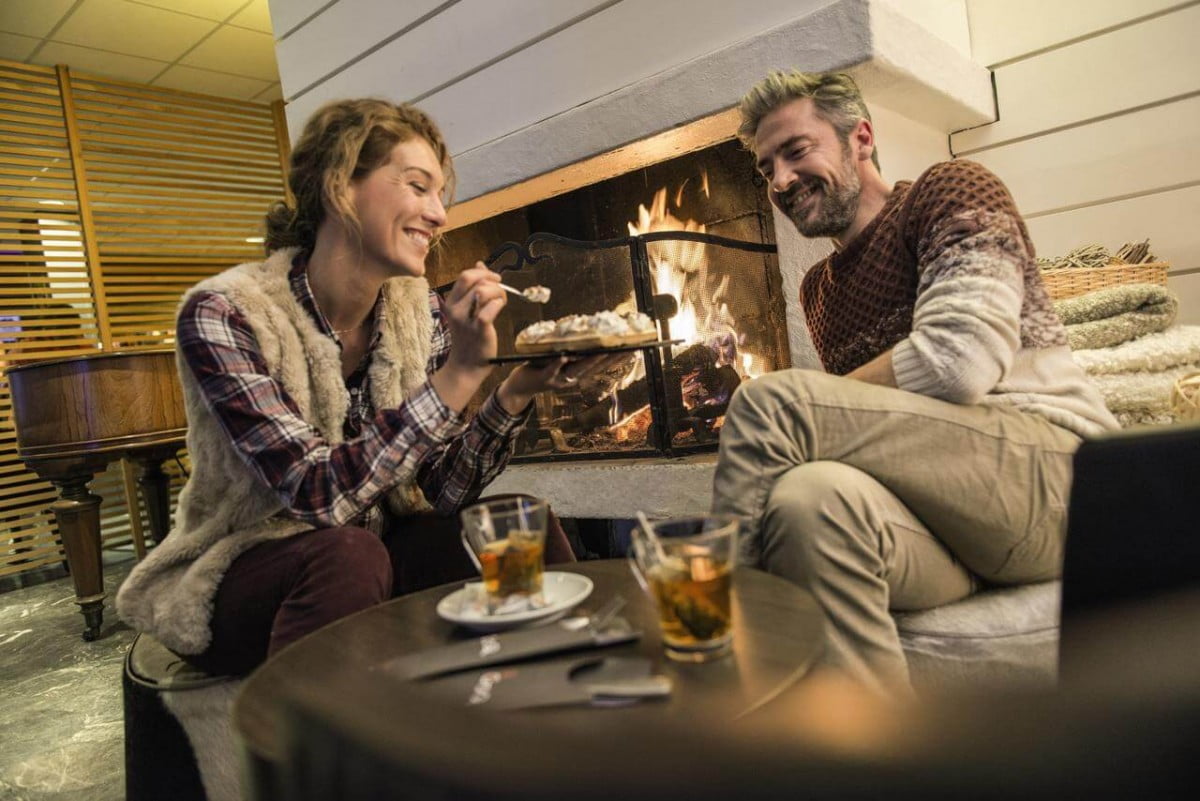 Un Bar avec cheminée et une terrasse accompagne la restauration.